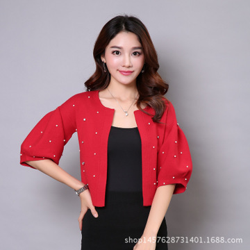 女式針織衫 2016春裝新款 韓版七分袖短款訂珠開(kāi)衫披肩外套 批發(fā) /