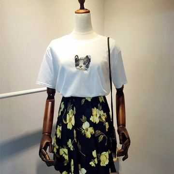 mori夏季新款韓版原單百搭休閑刺繡貓咪頭像寬松短袖純棉白T恤女 /