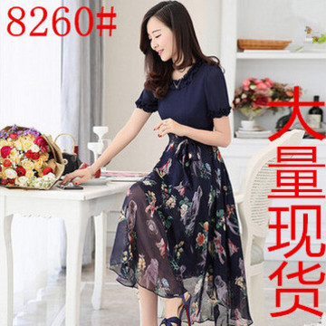 2016夏裝新款女裝修身顯瘦裙子印花雪紡中長款短袖連衣裙大擺裙 /