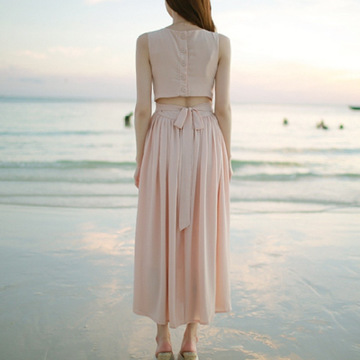 夏季韓國新款女裝背心長裙沙灘裙性感露背無袖大擺雪紡連衣裙 /