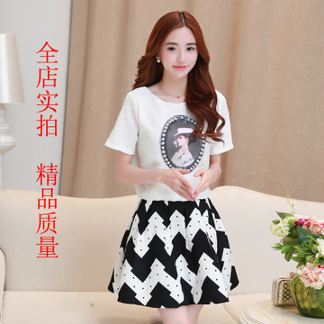 2016新品美女圖印花蕾絲上衣搭配百褶印花裙兩件套時尚套裙 /