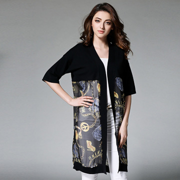 歐美潮流時(shí)尚款拼接外套女 桑蠶絲下擺寬松五分袖長(zhǎng)款印花開衫夏 /