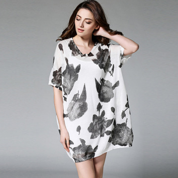 2016歐美中長(zhǎng)款苧麻印花套頭衫夏 短袖薄款寬松蝙蝠袖針織罩衫女 /