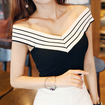 時尚韓版修身上衣性感露胸一字領無袖背心拼色百搭針織衫S166010 /