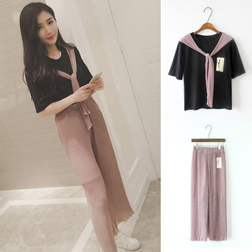 模特實拍 春夏韓版學院風顯瘦系帶純棉上衣+壓褶闊腿褲套裝36 /