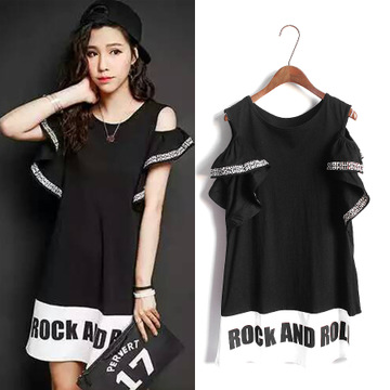 新款露肩連衣裙字母印花黑白拼接荷葉邊袖修身顯瘦上衣女5543 /