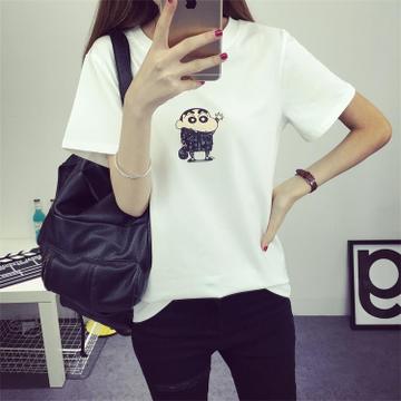韓版夏季寬松顯瘦圓領卡通動漫短袖 女t恤蠟筆小星印花夏季T恤 潮 /