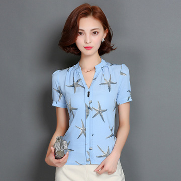 2016春夏裝新款韓版大碼女裝海星V領雪紡衫修身短袖打底衫上衣潮 /