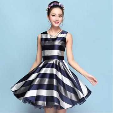 春夏新款韓版條紋無袖背心大碼修身氣質(zhì)蓬蓬連衣裙 /