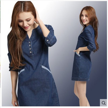 2016夏新款韓國代購春秋休閑寬松牛仔裙a字中長款七分長袖連衣裙 /