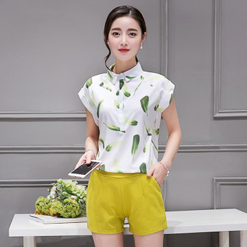 • 加大碼女裝雪紡套裝夏新款胖mm印花雪紡衫闊腿短褲兩件套 /