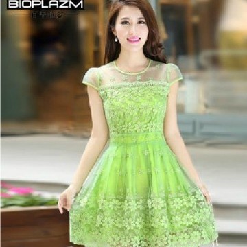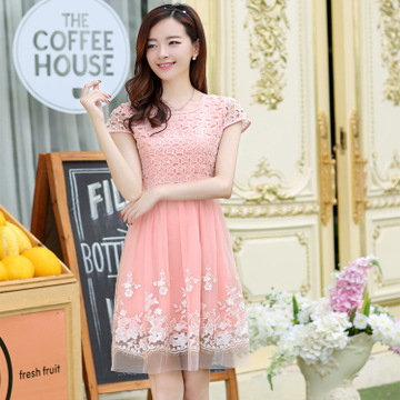 2016夏季新款女裝韓版修身歐根紗短袖連衣裙刺繡裙子 /