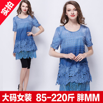 2016大碼女裝胖MM夏裝鑲鉆露肩短袖胖妹妹加肥加大牛仔連衣裙 /