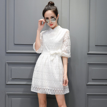 實拍夏季新款2016蕾絲亮片修身釘珠圓領(lǐng)刺繡女連衣裙(腰帶) /