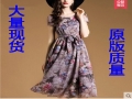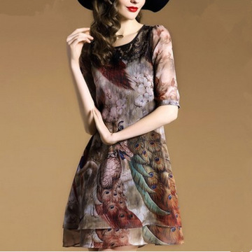 2016春裝新品女裝雙層裙擺孔雀印花連衣裙雪紡直筒裙 /