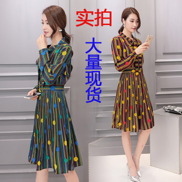 實拍 2016春裝新款韓版淑女蝴蝶結(jié)印花波點雪紡連衣裙百褶裙8555 /