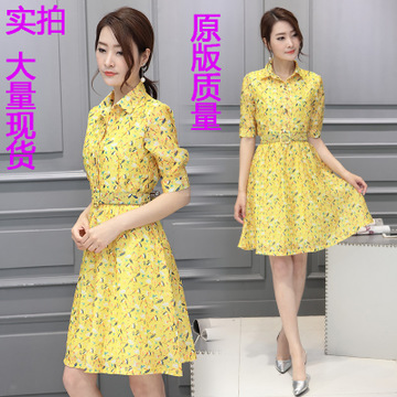 實拍 2016新款時尚歐美印花A字裙翻領短袖腰帶顯瘦連衣裙女 /