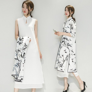中國風旗袍寬松腰水墨印花七分袖兩件套連衣裙2016春夏新款 女 /
