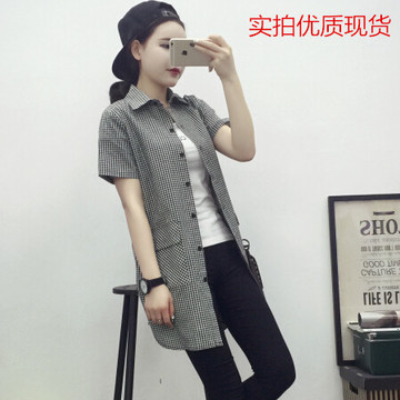 夏季韓版大碼開衫短袖女裝文藝寬松休閑棉麻格子襯衫 中長款上衣 /