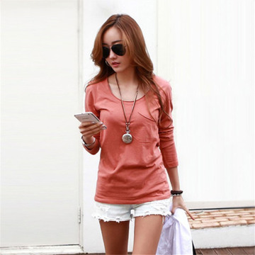• 2016春夏季女裝韓版打底衫小V領(lǐng)中長款寬松上衣純棉長袖T恤衫批發(fā) /