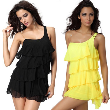 2016速賣通爆款甜美荷葉邊多層拼接斜肩公子連衣裙 /
