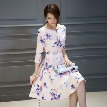 2016女裝新款印花中裙一字領七分袖A字連衣裙 /