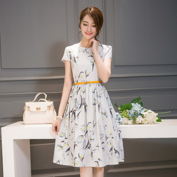 歐美夏裝新款女裝修身顯瘦印花中長款短袖連衣裙 /