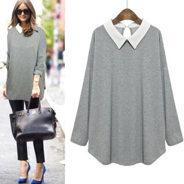 ebay春季新款大碼女裝中長打底衫歐美外貿(mào)寬松露背翻領(lǐng)長袖女T恤 /