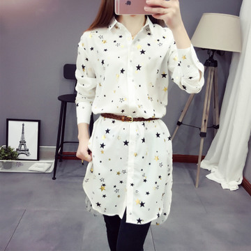 2016春新款韓版女裝黑白五角星印花長袖休閑長款雪紡襯衣女裝顯瘦 /