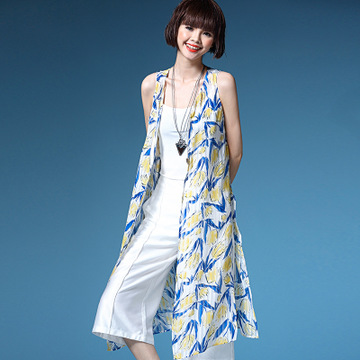雪紡開(kāi)衫馬夾2016新款韓版修身顯瘦中長(zhǎng)款印花馬甲女薄款防曬外套 /