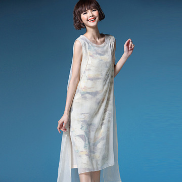 2016夏季薄款休閑印花雪紡女裙中長(zhǎng)款寬松大碼防曬圓領(lǐng)套頭連衣裙 /