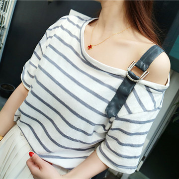 現(xiàn)貨實(shí)拍 精品 氣質(zhì)條紋皮帶露肩寬松上衣+收腰百褶半裙套裝 /