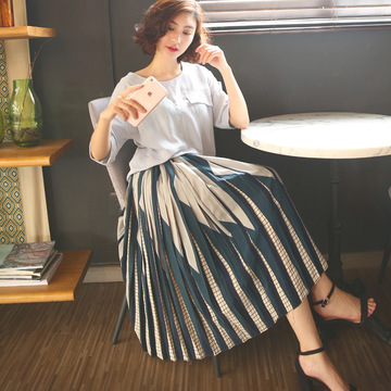 實(shí)拍 條紋幾何百褶半身裙 壓皺雪紡漸變印花寬松半身長裙 /