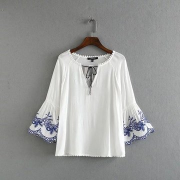 外貿(mào)批發(fā)歐美時(shí)尚民族風(fēng)袖口重工刺繡系帶棉襯衣七分袖襯衫速賣通 /