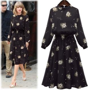 歐洲站春季新款碎花復(fù)古顯瘦長袖打底雪紡連衣裙 /