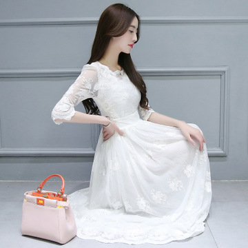 2016新款韓白色領(lǐng)勾花縷空刺繡蕾絲裙五分袖氣質(zhì)大擺長裙 /