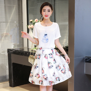 套裝連衣裙2016夏季歐洲站新款短袖t恤雪紡蓬蓬裙印花半身短裙子 /