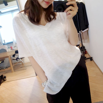 竹節(jié)棉白色短袖T恤女大碼夏季V領(lǐng)T恤韓版新品批發(fā)一件代發(fā)D6006 /