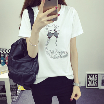 1621#實拍夏裝新款2016韓版寬松 亮片刺繡狐貍磨毛圓領(lǐng)短袖T恤女 /