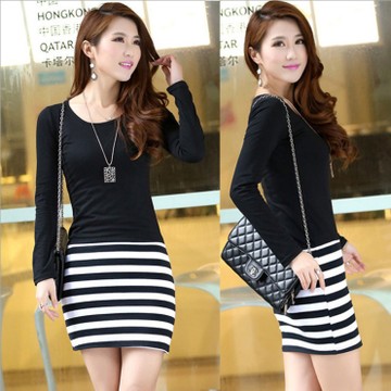 一件代發(fā)批發(fā)秋裝連衣裙長(zhǎng)袖修身?xiàng)l紋拼接顯瘦氣質(zhì)包臀淑女 /