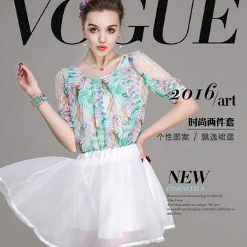 清新夏季新款印花雪紡衫短袖圓領(lǐng)女上衣歐根紗半身短裙兩件套女裝 /