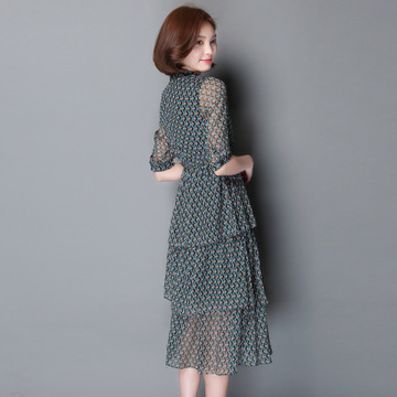 2016新款夏季雪紡連衣裙女修身高腰五分袖中長款波西米亞蛋糕裙 /