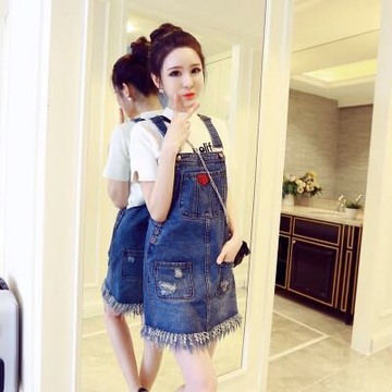 2016夏季破洞牛仔背帶裙中長款半身流蘇毛邊潮 /