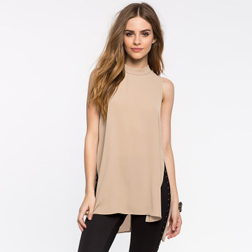 歐美范時(shí)尚簡(jiǎn)約雙側(cè)開(kāi)衩前短后長(zhǎng)設(shè)計(jì)修身無(wú)袖雪紡衫 /
