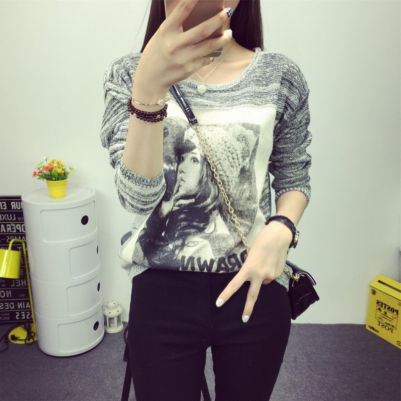 2秋裝新款女裝休閑寬松女式針織衫 圓領(lǐng)套頭人形印花韓范潮女毛衣 /