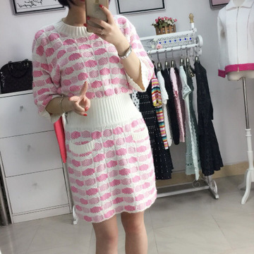 新款優(yōu)雅名媛風(fēng)收腰羊絨套頭針織連衣裙女裝粉粉重磅機(jī)理連衣裙 /