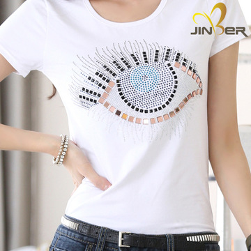 實(shí)拍韓版修身顯瘦大眼睛燙鉆奧代爾純棉T恤女短袖潮 /