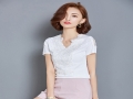 2016夏裝新款純色v領(lǐng)短袖T恤 韓版氣質(zhì)修身蕾絲花邊雪紡上衣女 /