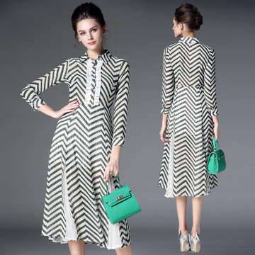 歐洲站 2016春夏女裝新款幾何接拼翻領(lǐng)九分袖開叉大擺連衣裙2034 /