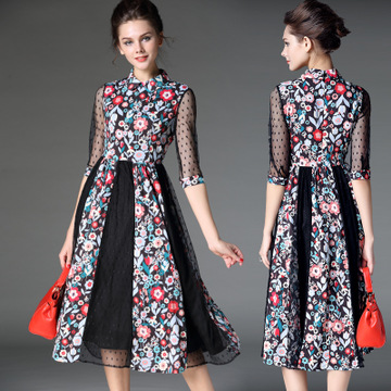 歐洲站2016女裝春款潮流新品大牌數(shù)碼印花翻領(lǐng)中袖大擺連衣裙2035 /